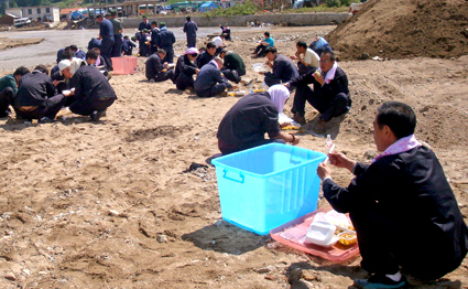 隆基志愿者在勞動(dòng)之余席地用餐